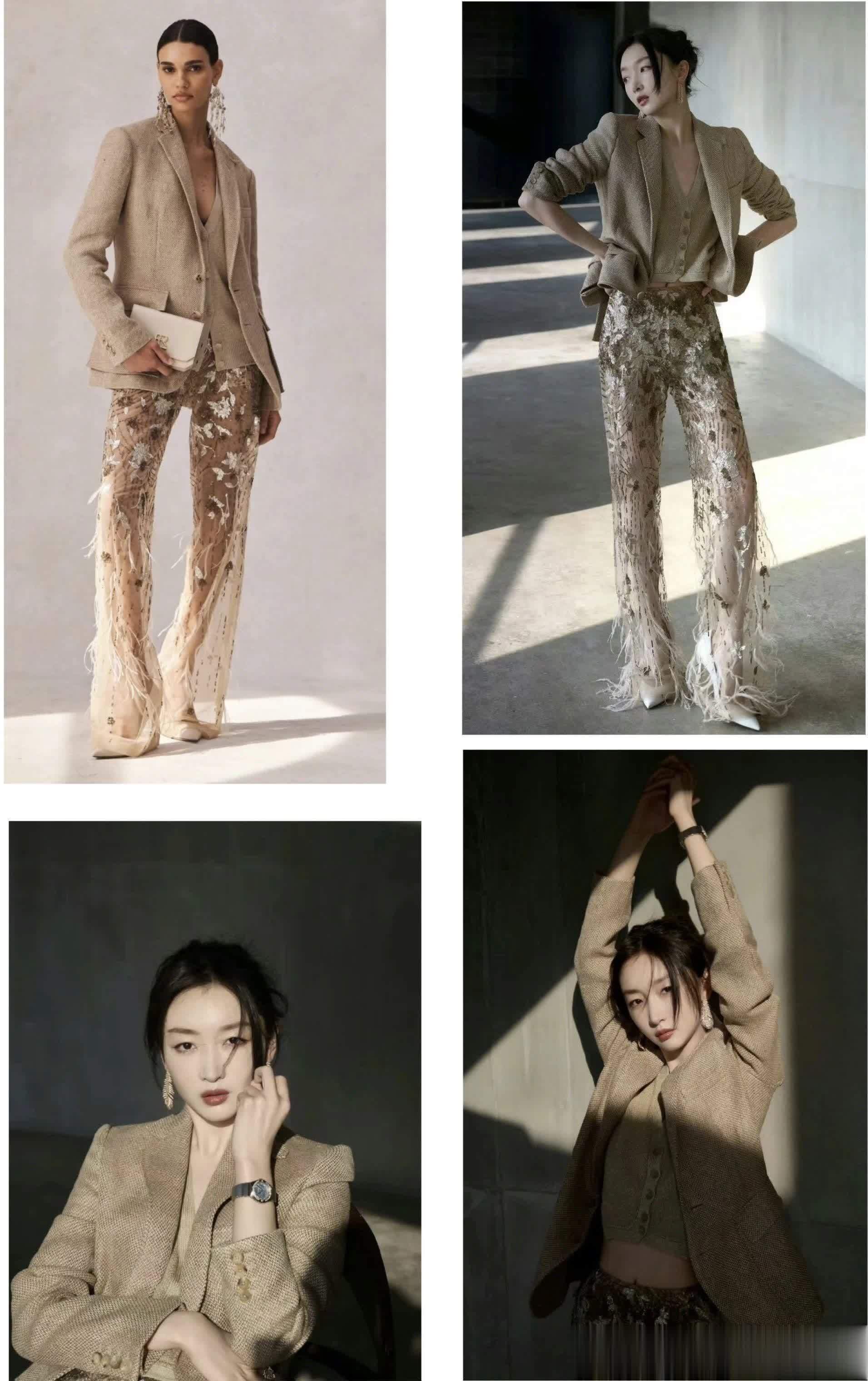 身穿麻感西装外套,内搭同色系短款针织开衫,同色系透纱羽毛长裤,轻盈又灵动,整套搭配高调,个性,又简约干练,跟以往“假小子”装扮的周冬雨,大相径庭。