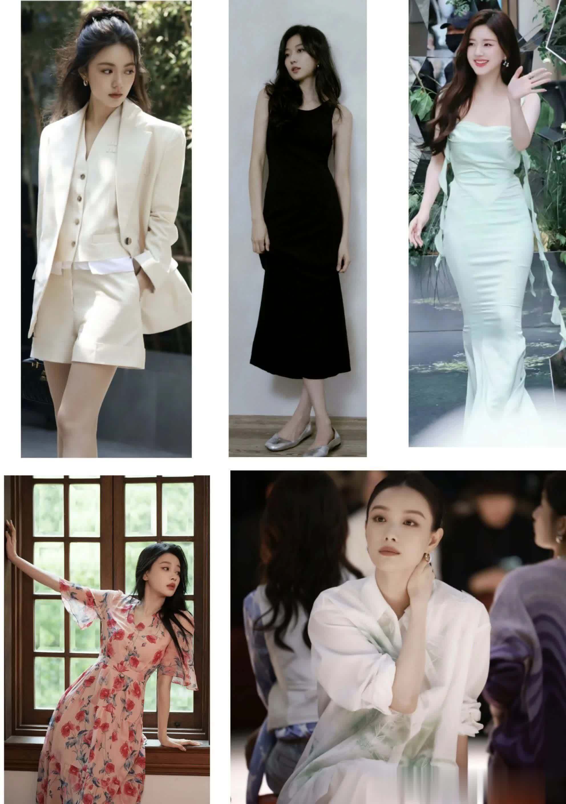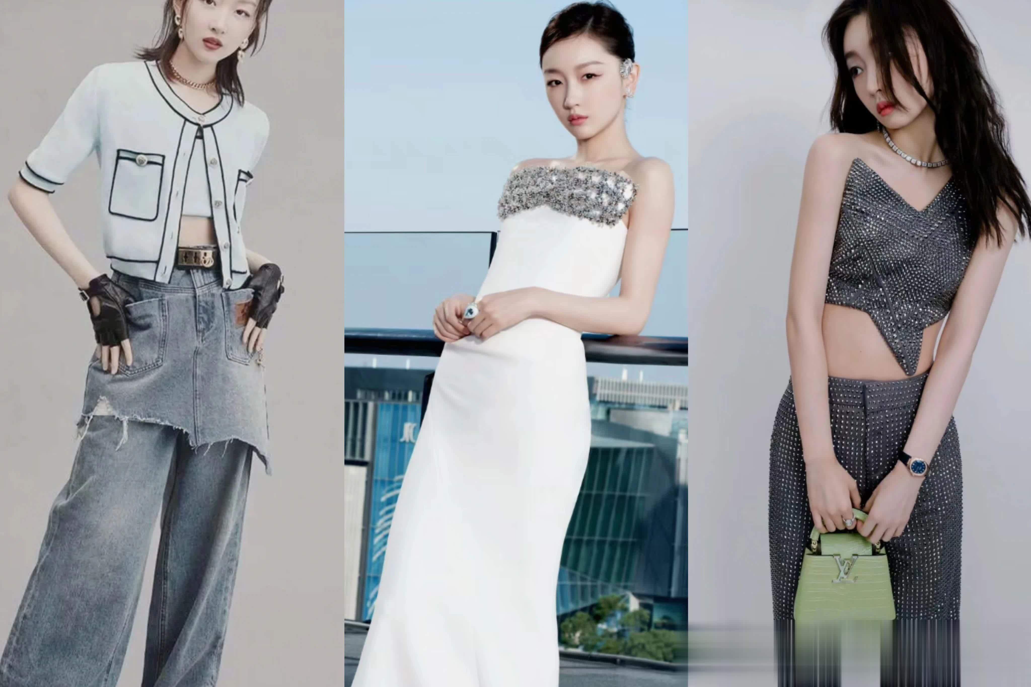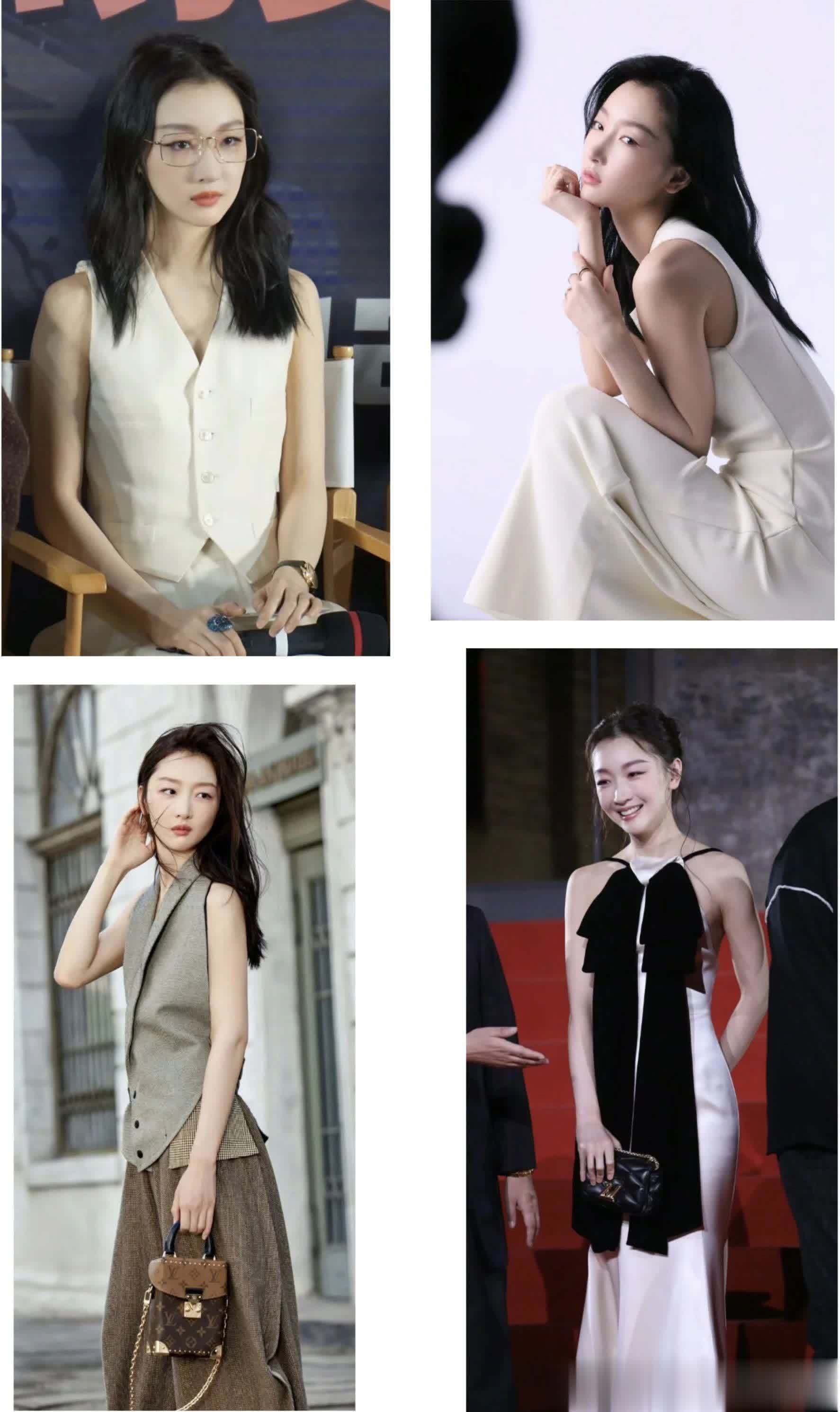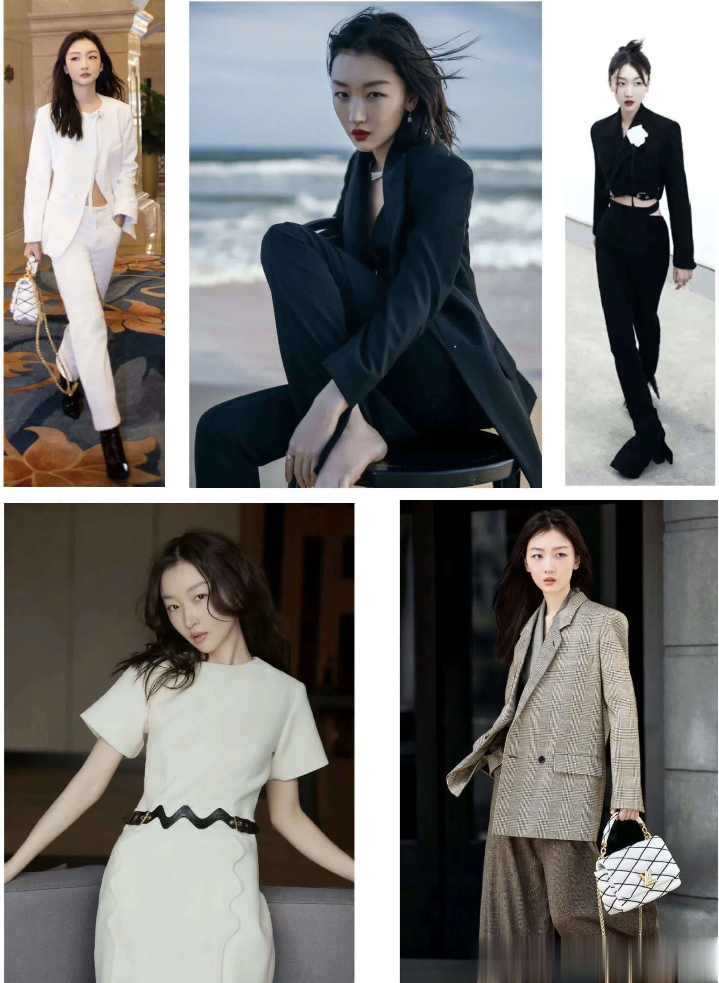 周冬雨的温婉甜美风穿搭也备受关注,如白色套装、小香风穿搭等,展现出她优雅的气质。